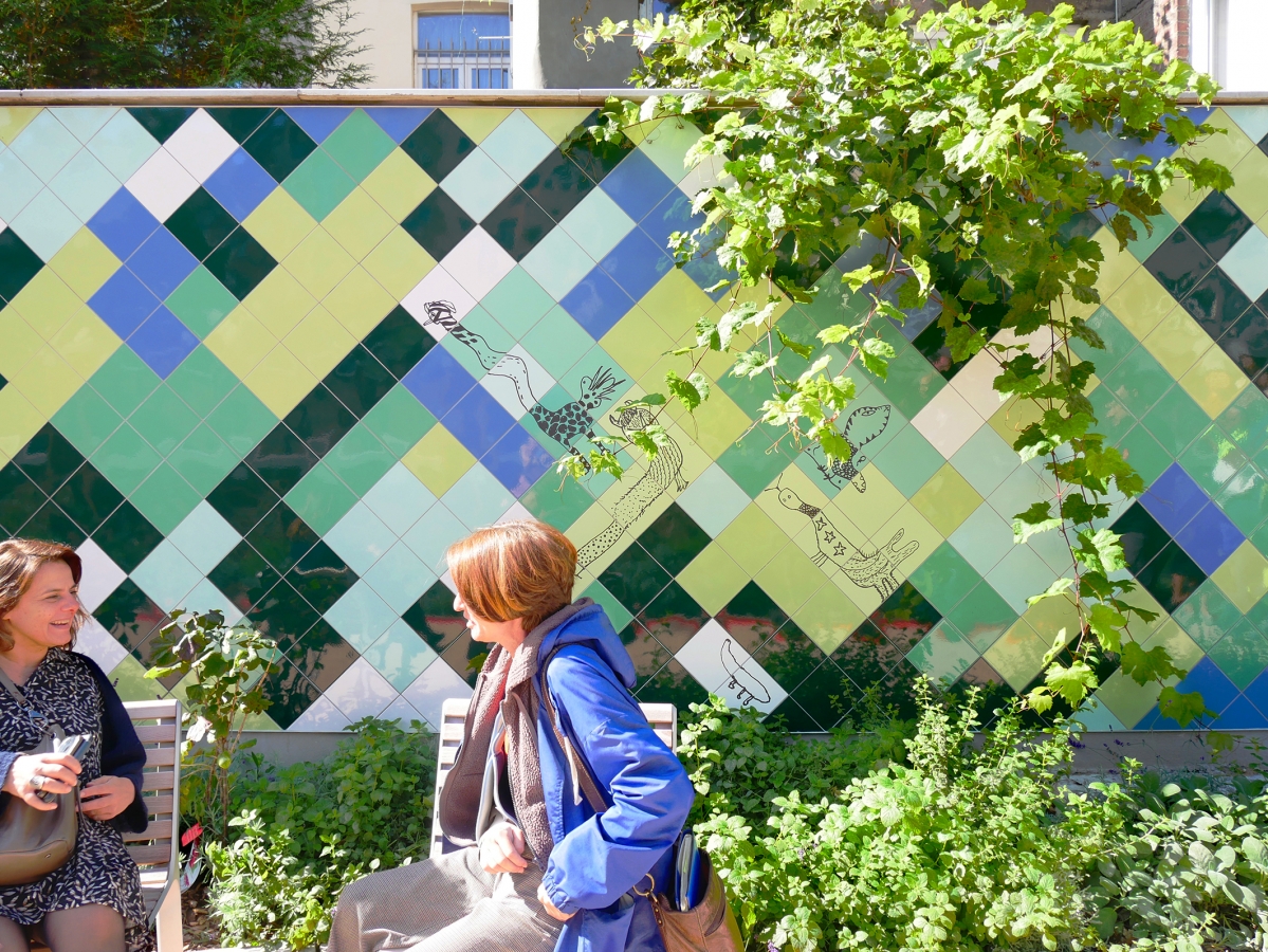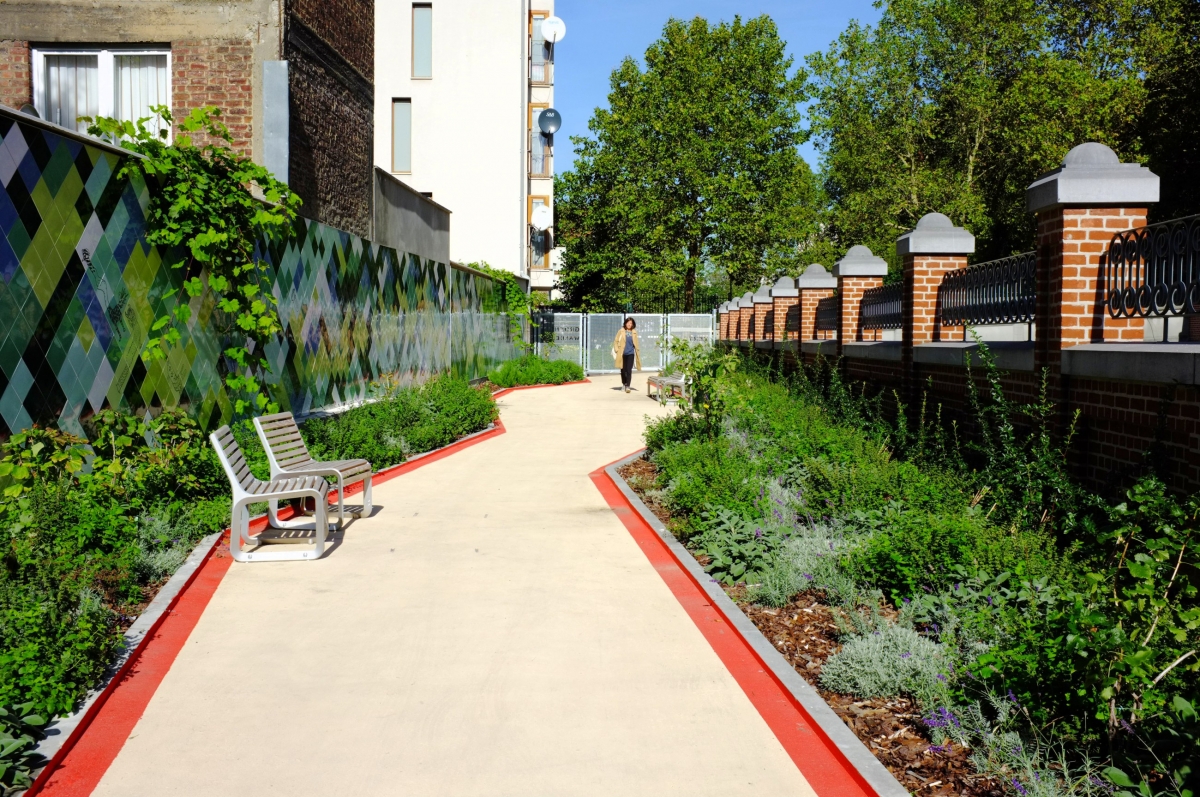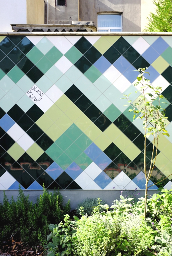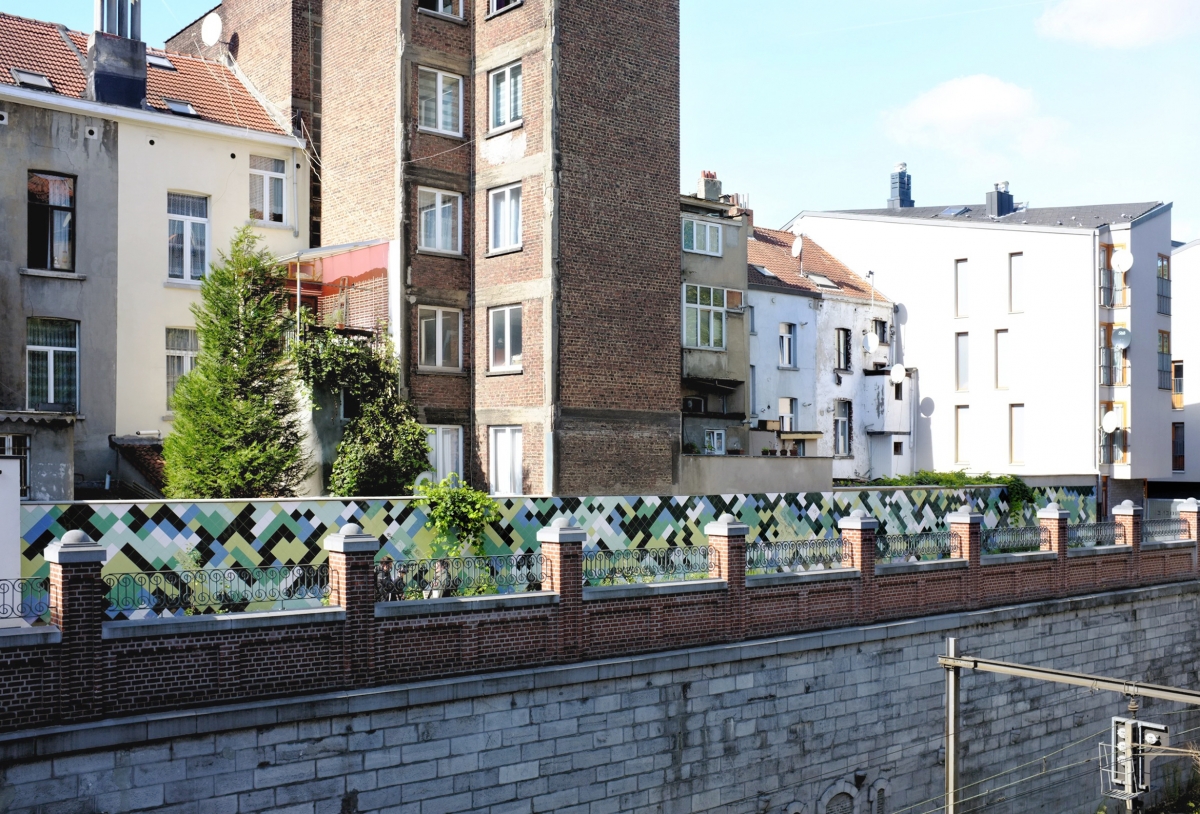 Le motif et la réalisation des carreaux a été réalisés par l’Atelier Blink et Nonpareil, le placement des carreaux par une entreprise de réinsertion socio-économique en construction, basée dans la commune de Saint-Josse-ten-Noode.