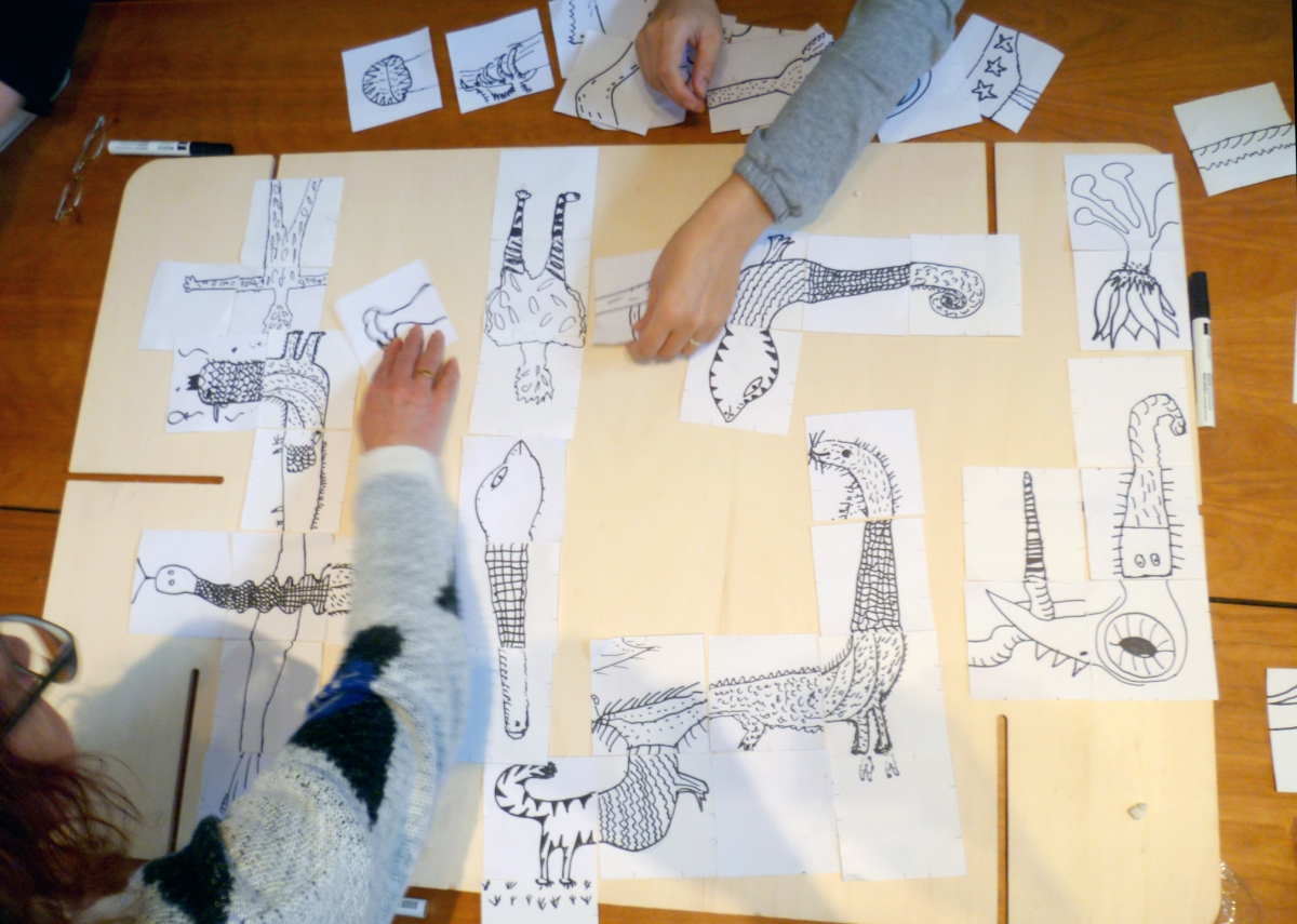 Élaborés sur le principe du « cadavre exquis », les dessins s’inspirent des mondes végétal, animal et aquatique. Combinés entre eux, ils deviennent des créatures fantastiques courant