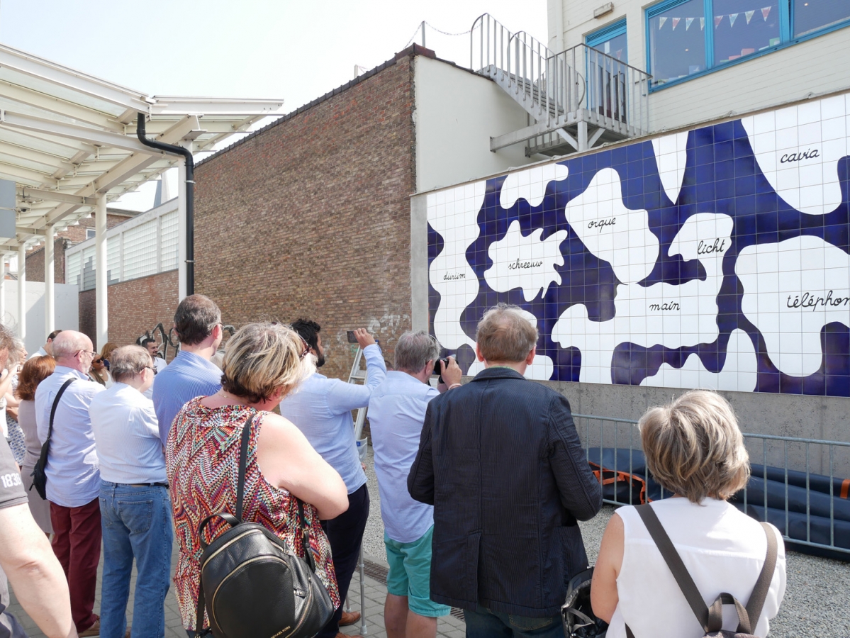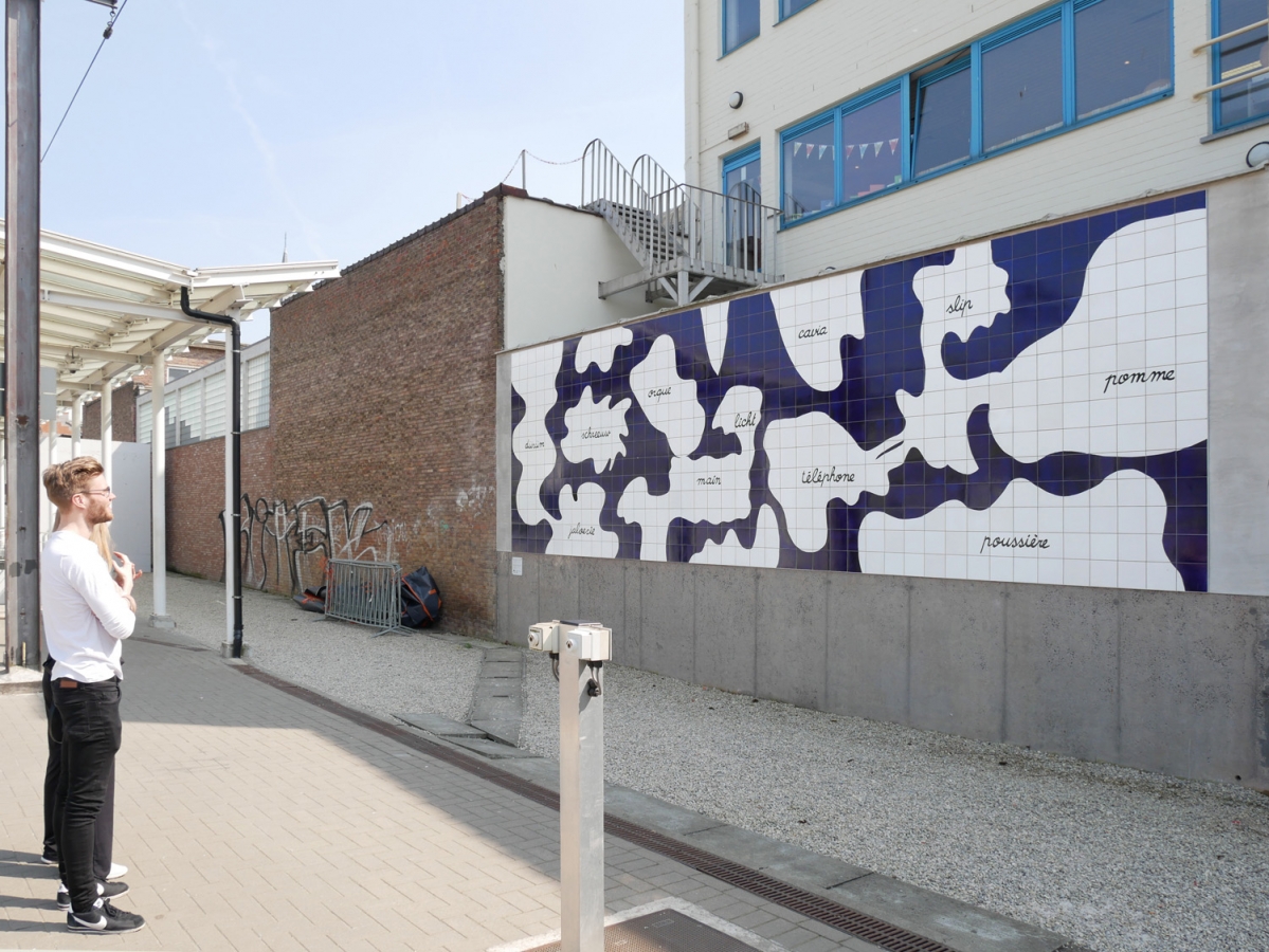 Fresque en carrelage réalisée suite aux ateliers avec les enfants de 4è et 6è primaires des écoles Arbre Ballon et Poelbos (Jette) : répertoire des mots de leur quotidien, abstraction des formes, élaboration de récits.