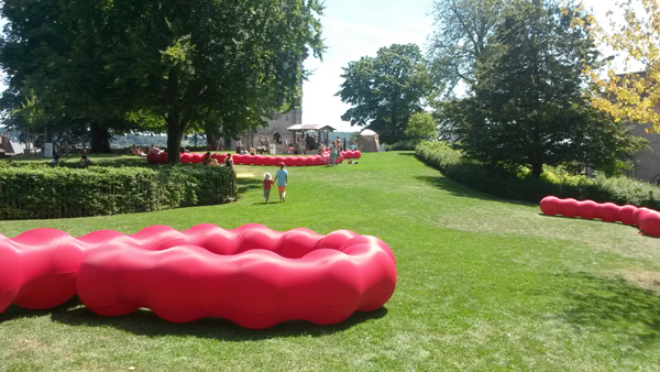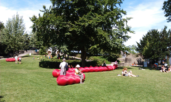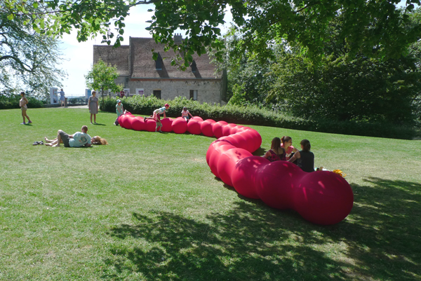L’installation comprenait notamment des structures géantes en forme de chenille et des balançoires suspendues aux arbres, activant le paysage du parc et invitant les enfants à découvrir des formes ludiques, à interagir physiquement avec l’environnement et à explorer le site avec curiosité et émerveillement.