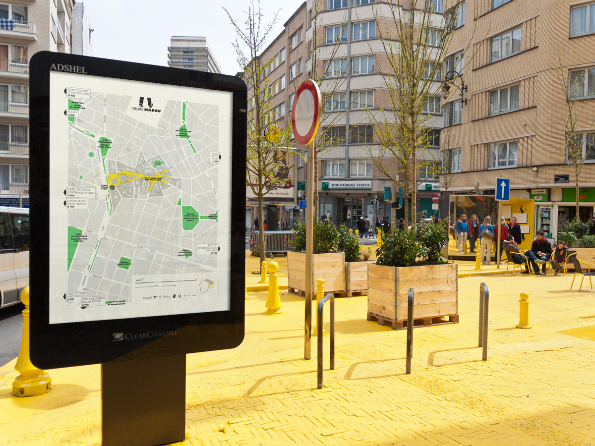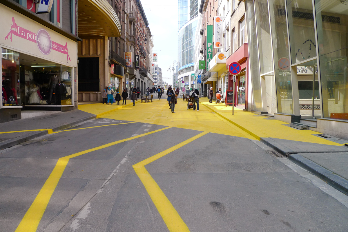 Création d’un piétonnier temporaire. Réalisée avec des moyens très limités, cette installation avait comme objectif de servir de test en vue de la mise en place d’un projet piétonnier définitif conçu par le bureau “Grontmij”.