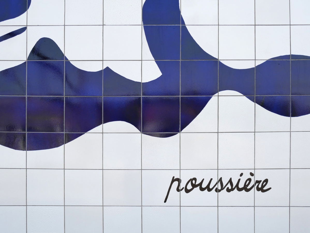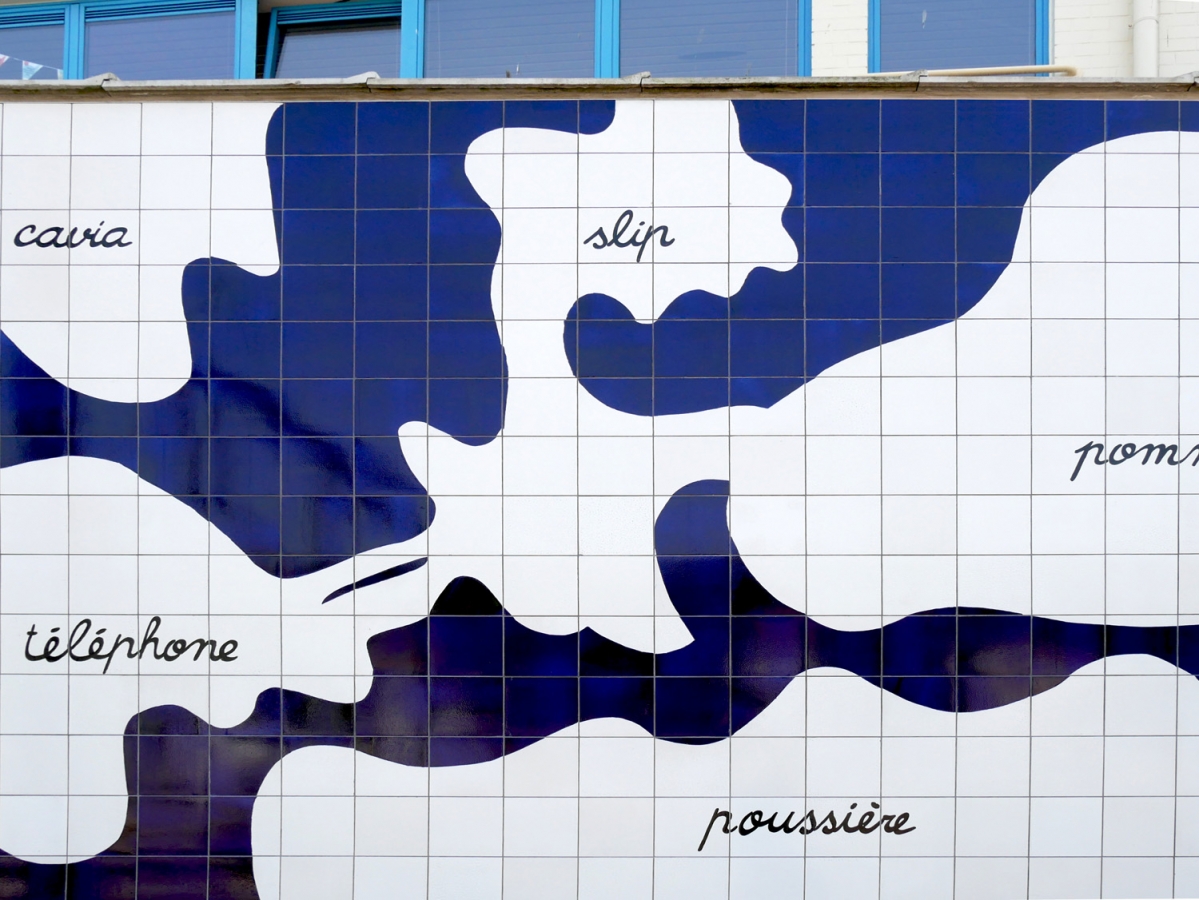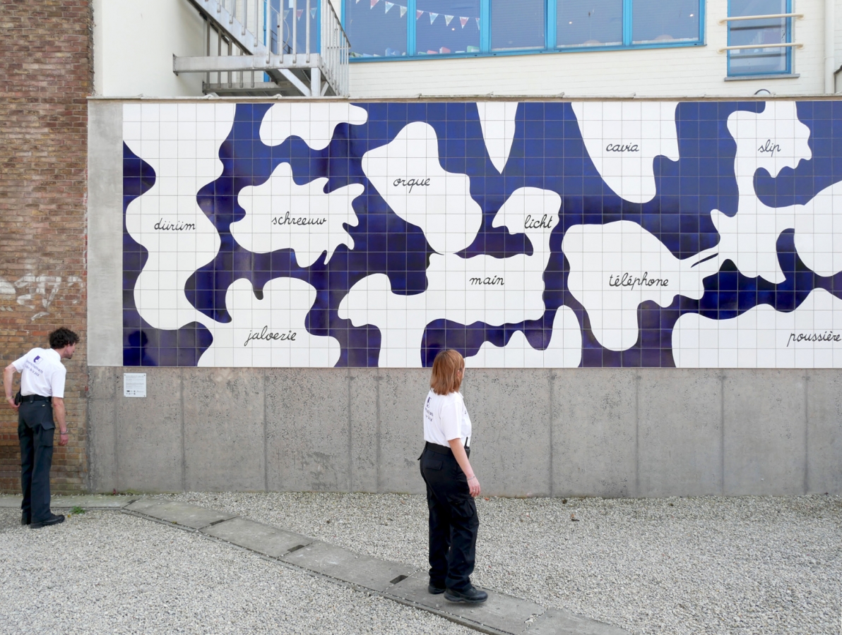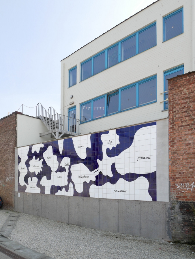 Fresque en carrelage réalisée suite aux ateliers avec les enfants de 4è et 6è primaires des écoles Arbre Ballon et Poelbos (Jette) : répertoire des mots de leur quotidien, abstraction des formes, élaboration de récits.