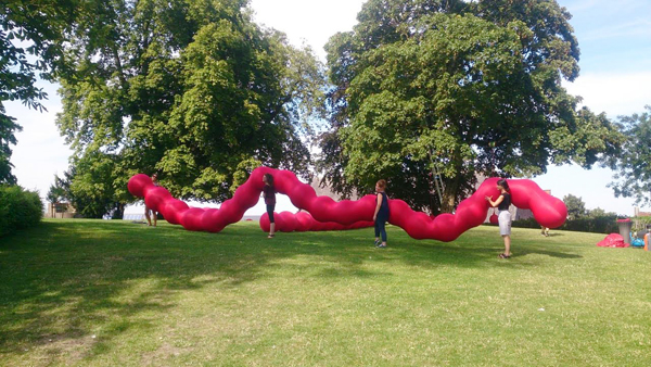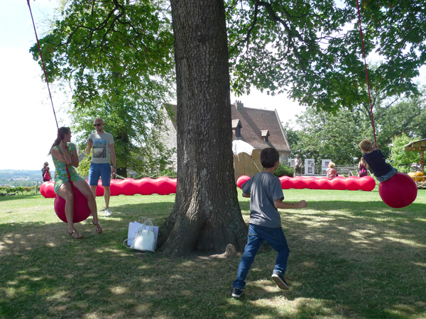 L’installation comprenait notamment des structures géantes en forme de chenille et des balançoires suspendues aux arbres, activant le paysage du parc et invitant les enfants à découvrir des formes ludiques, à interagir physiquement avec l’environnement et à explorer le site avec curiosité et émerveillement.