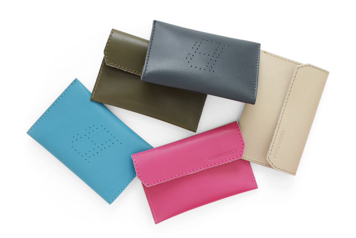 Pochettes en cuir dessinées pour VisitBrussels, disponibles en 2 formats et 5 couleurs.
