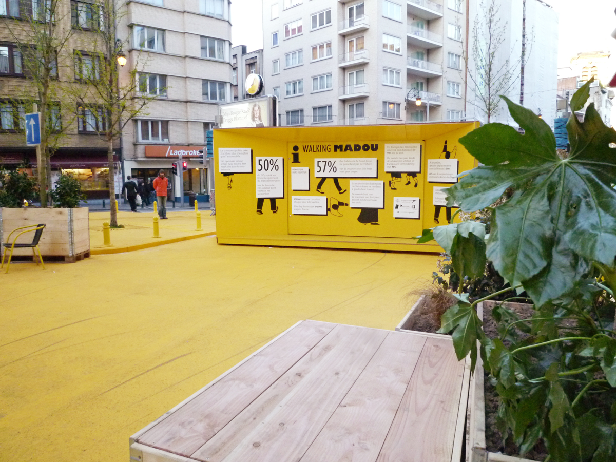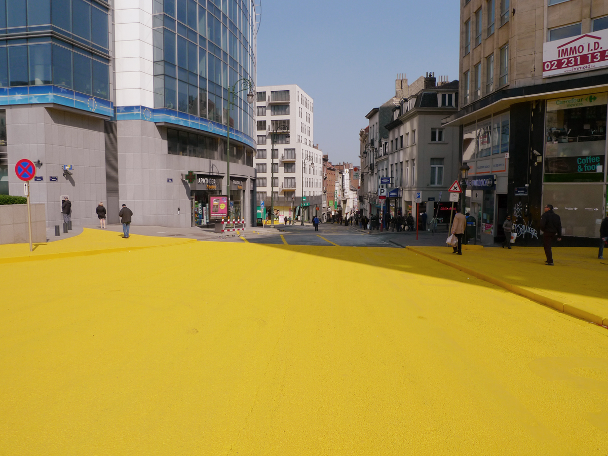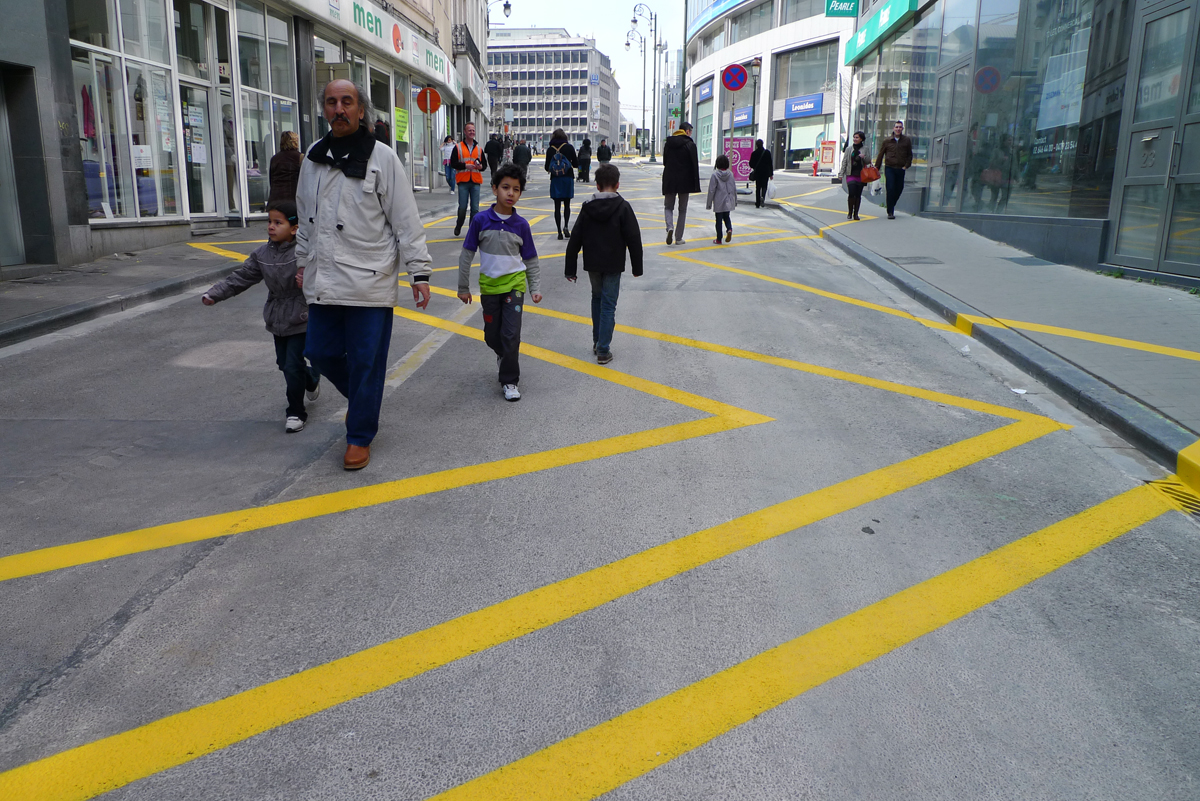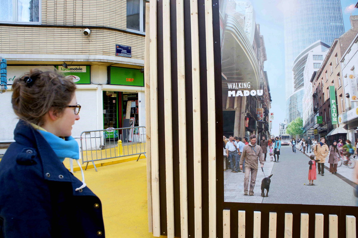 Création d’un piétonnier temporaire. Réalisée avec des moyens très limités, cette installation avait comme objectif de servir de test en vue de la mise en place d’un projet piétonnier définitif conçu par le bureau “Grontmij”.