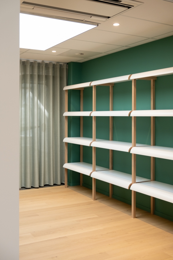 Une part importante du projet repose sur la récupération et la réutilisation des matériaux issus de la démolition. Certains éléments ont été conservés et réinterprétés, comme les panneaux des anciens cache-radiateurs, transformés en bibliothèque sur mesure.